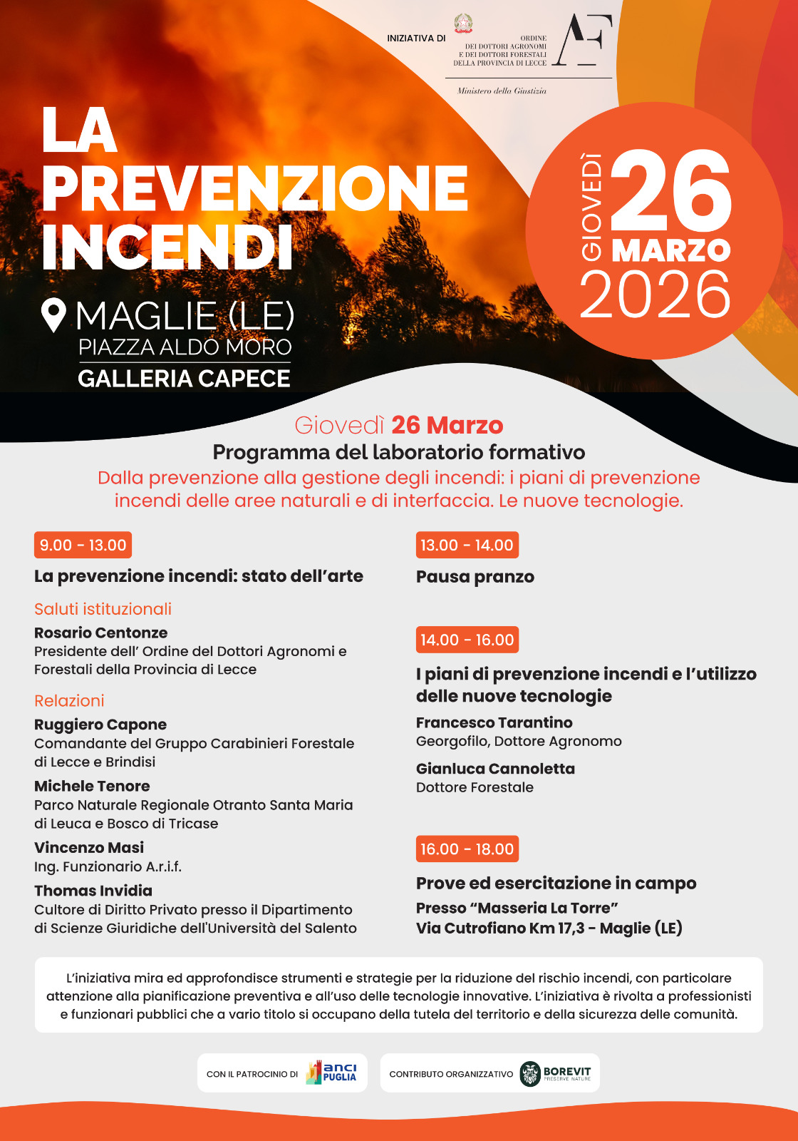 Giovedì 26 marzo 2026 si terrà a Maglie (LE) il laboratorio formativo dal titolo: “Dalla prevenzione alla gestione degli incendi: i piani di prevenzione incendi delle aree naturali e di interfaccia. Le nuove tecnologie”.